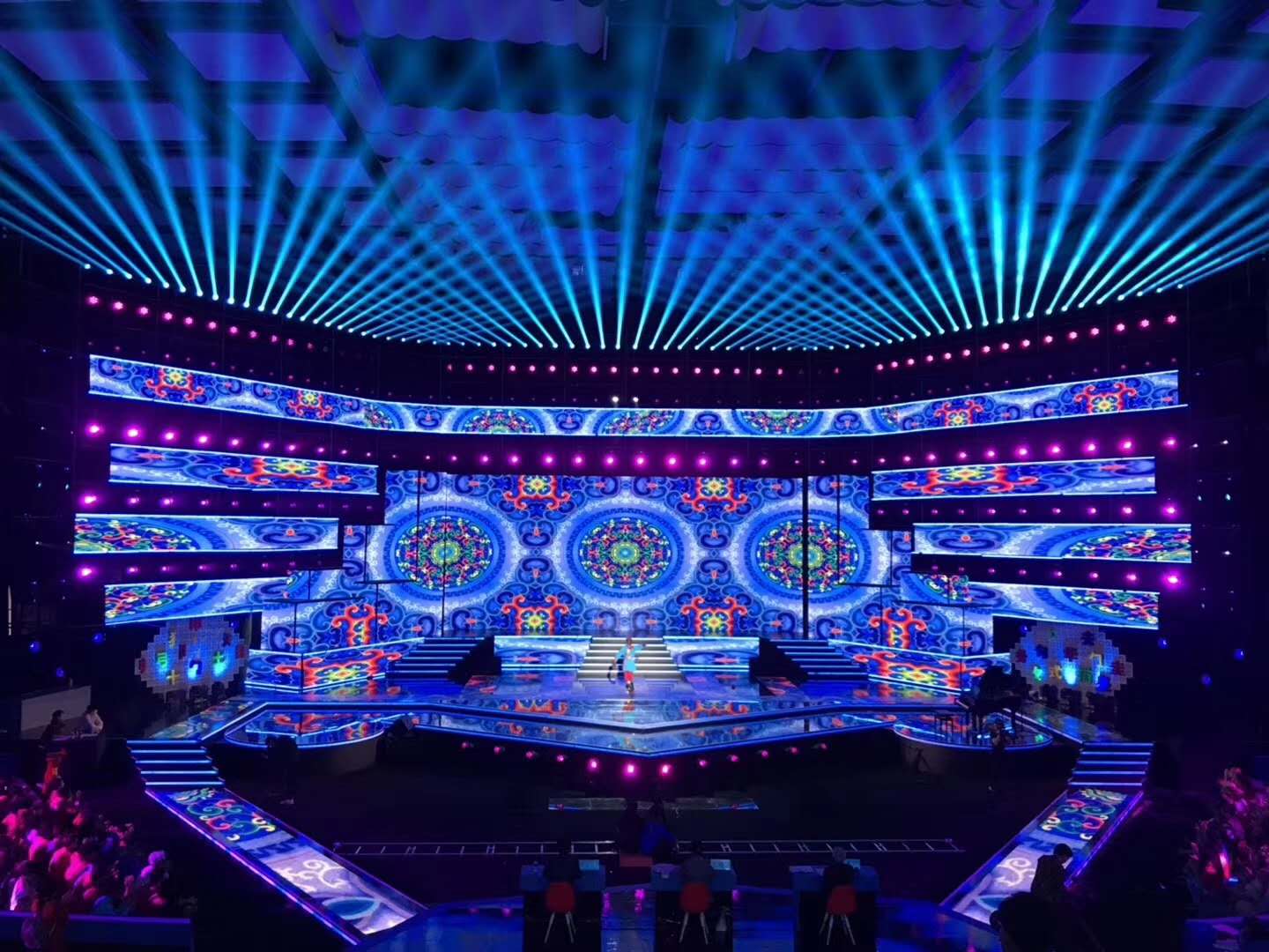 其中,浩洋電子1400W的氣泡光源高顯指圖案切割燈V4000P在舞臺(tái)上的表現(xiàn)尤為突出,在保證燈具高光通量輸出的同時(shí),也保證了極高的光斑均勻度,投射出很好的光質(zhì);其點(diǎn)狀梳形結(jié)構(gòu)的CMY+CTO+CTB混色系統(tǒng),也使之保持均勻順滑混色效果;最值得一提的是,其顯色指數(shù)高達(dá)97,最為接近太陽光100的顯色指數(shù)。在浩洋電子V4000P的照射下,其顯示的顏色與在自然光照下所顯現(xiàn)的顏色差異比較小,更接近自然原色,其色彩還原性極為出色!